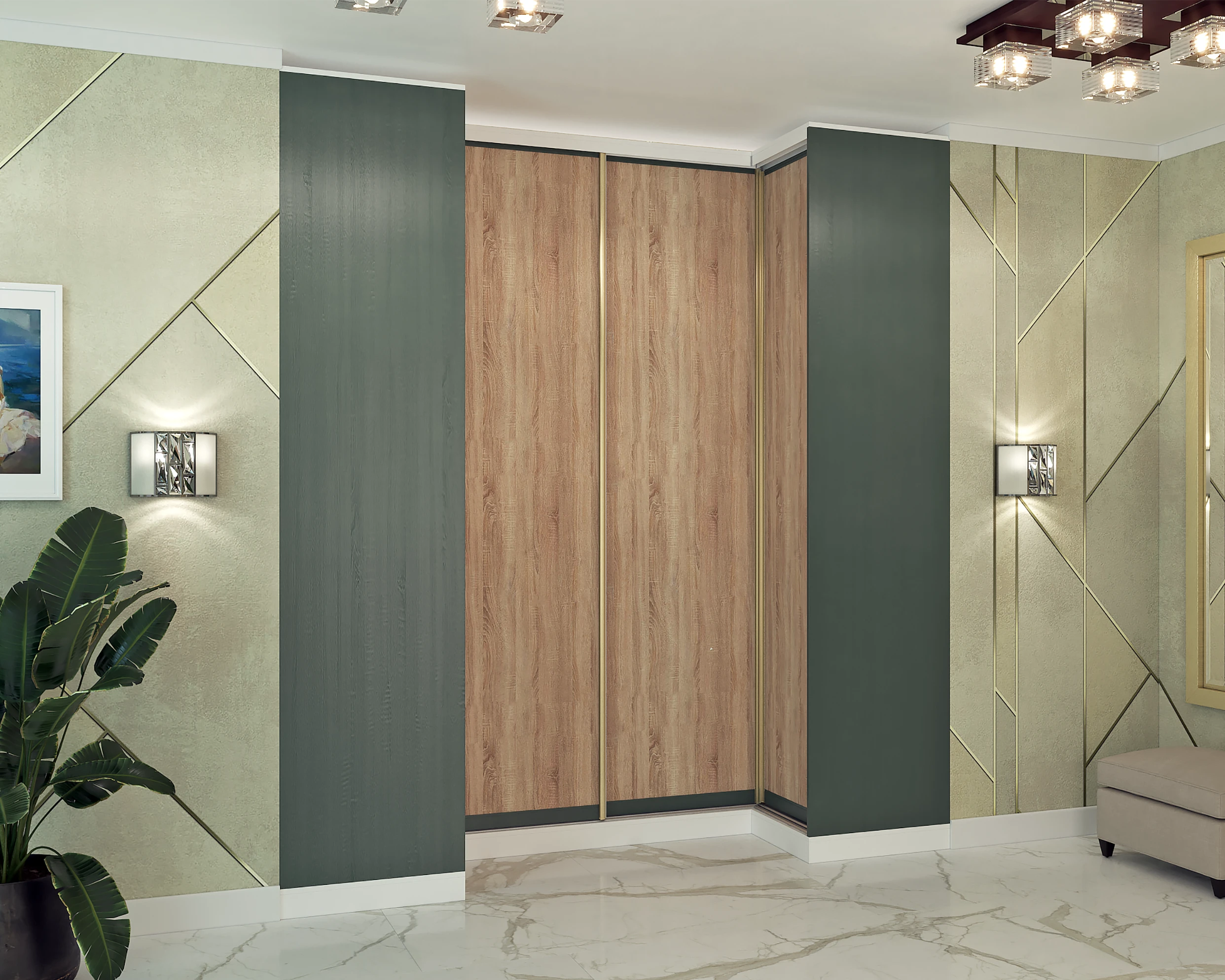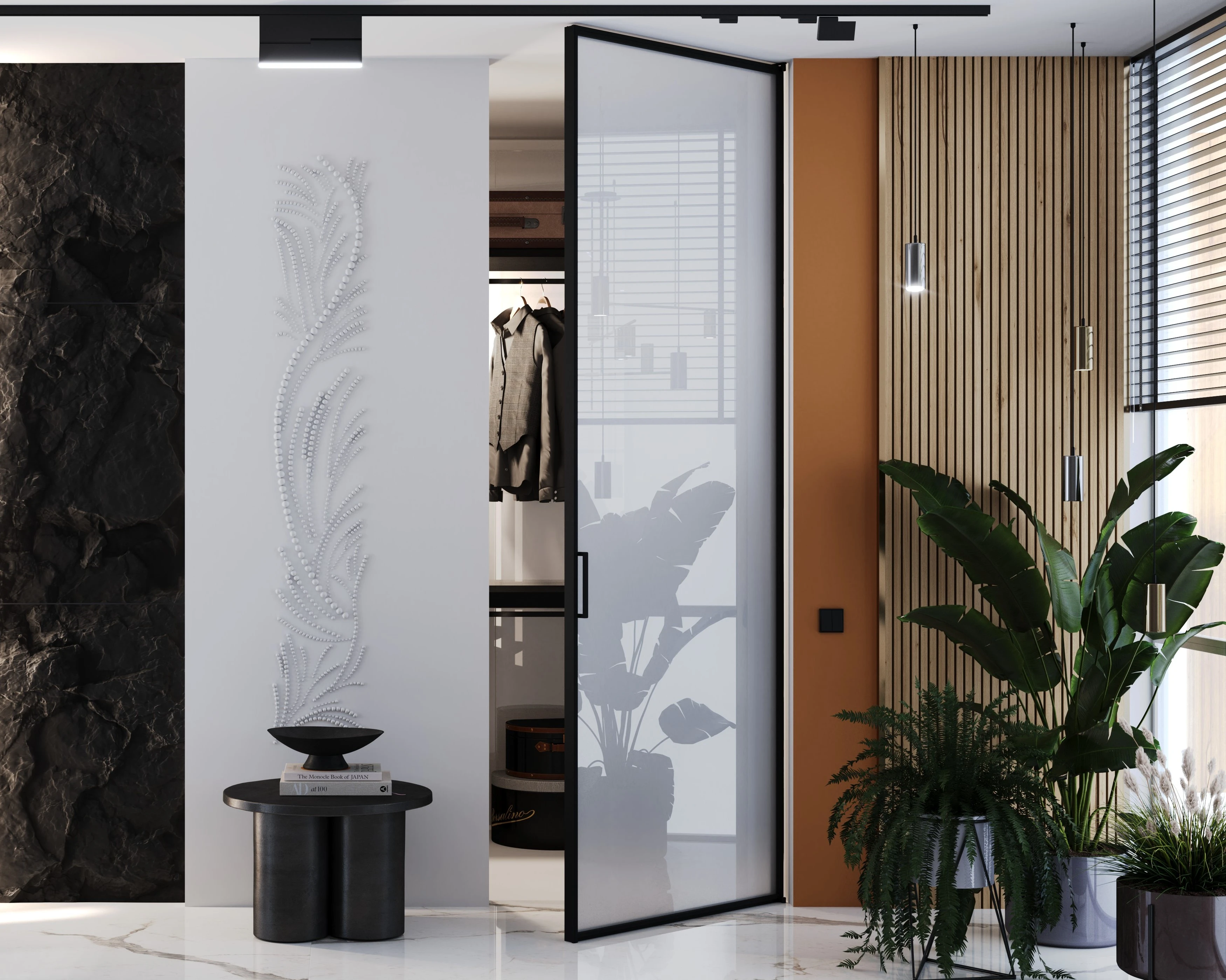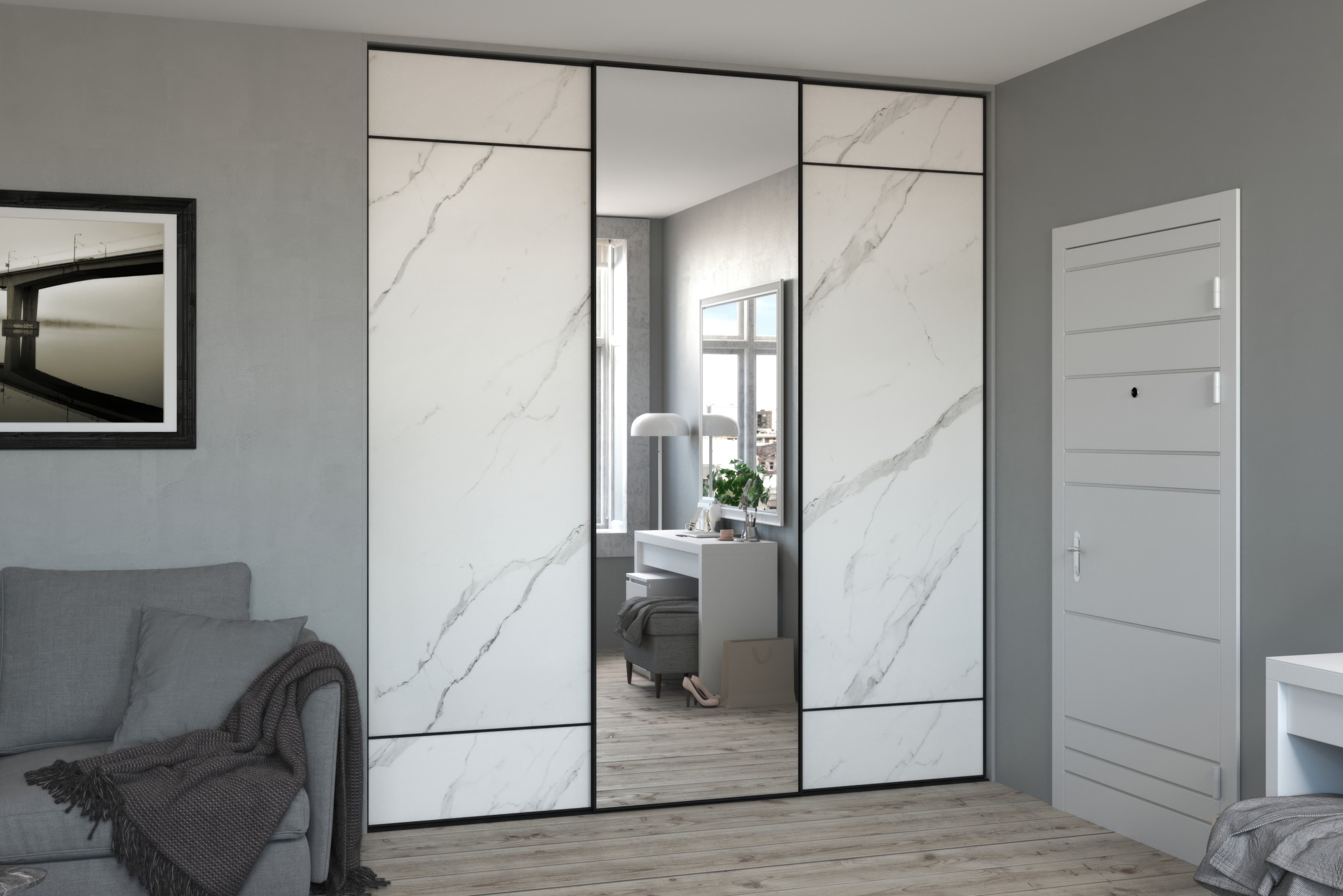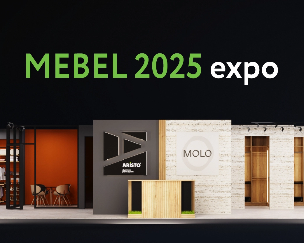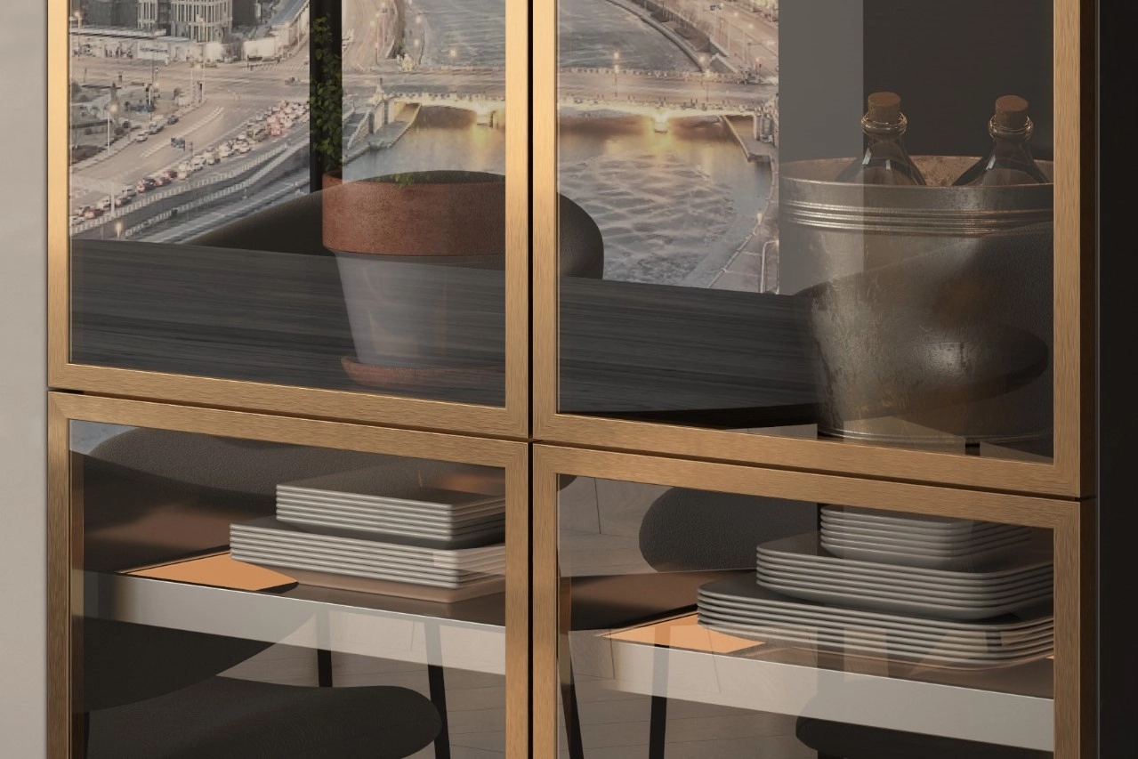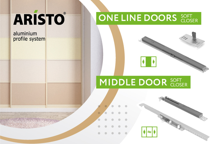 A system of profiles and pivot fittings for glass or mirror doors – invisible hinges, profile handles and hidden furniture body