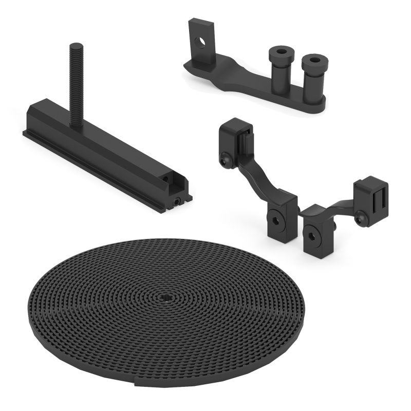 suspension 2 pcs, washer with screw 2 pcs, installation screw 4 pcs, left belt fastener 1 pc, right belt fastener 1 pc, belt 3 m, roller 2 pcs, screw M4x10 2 pcs, screw M4x8 2 pcs