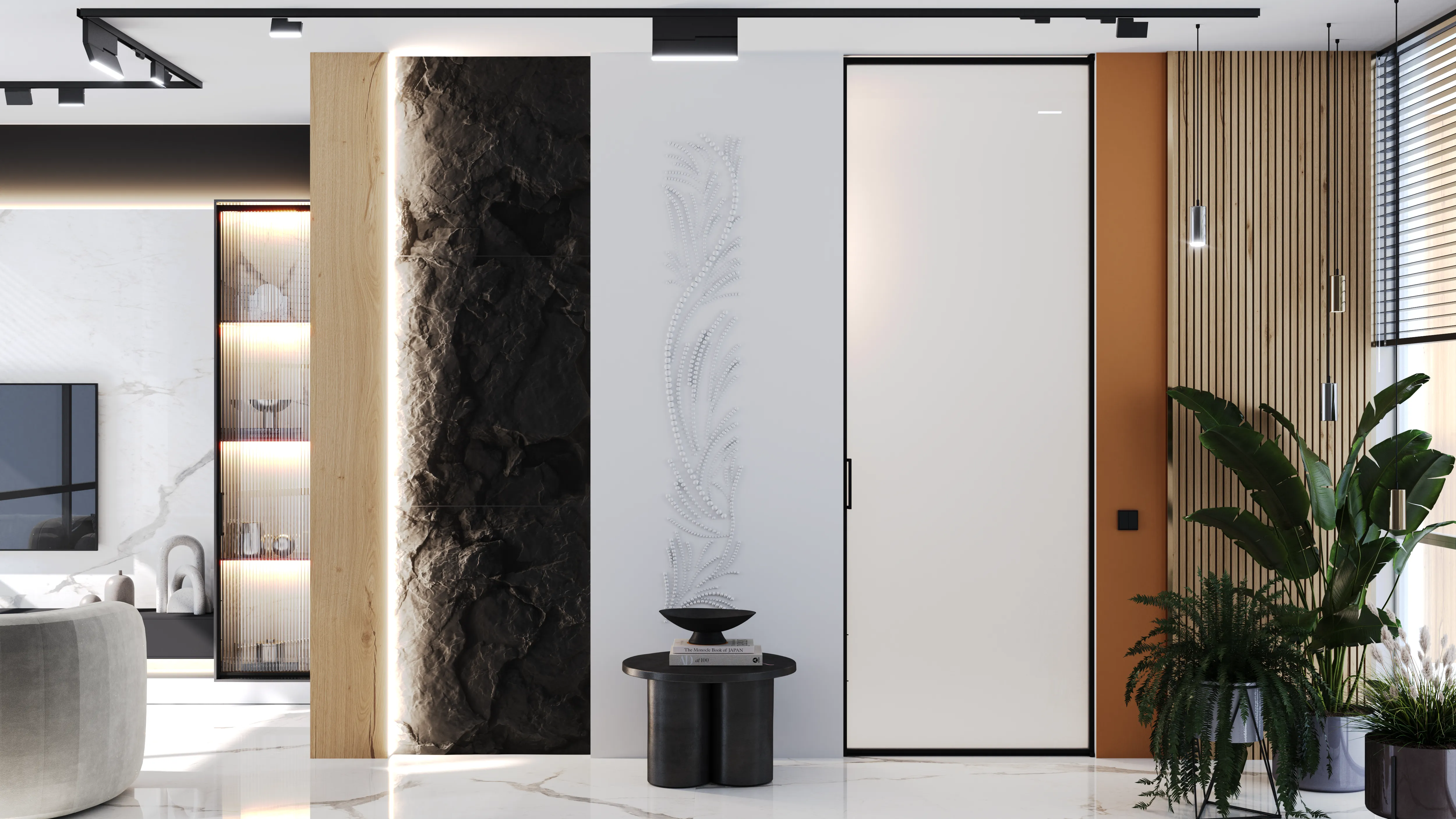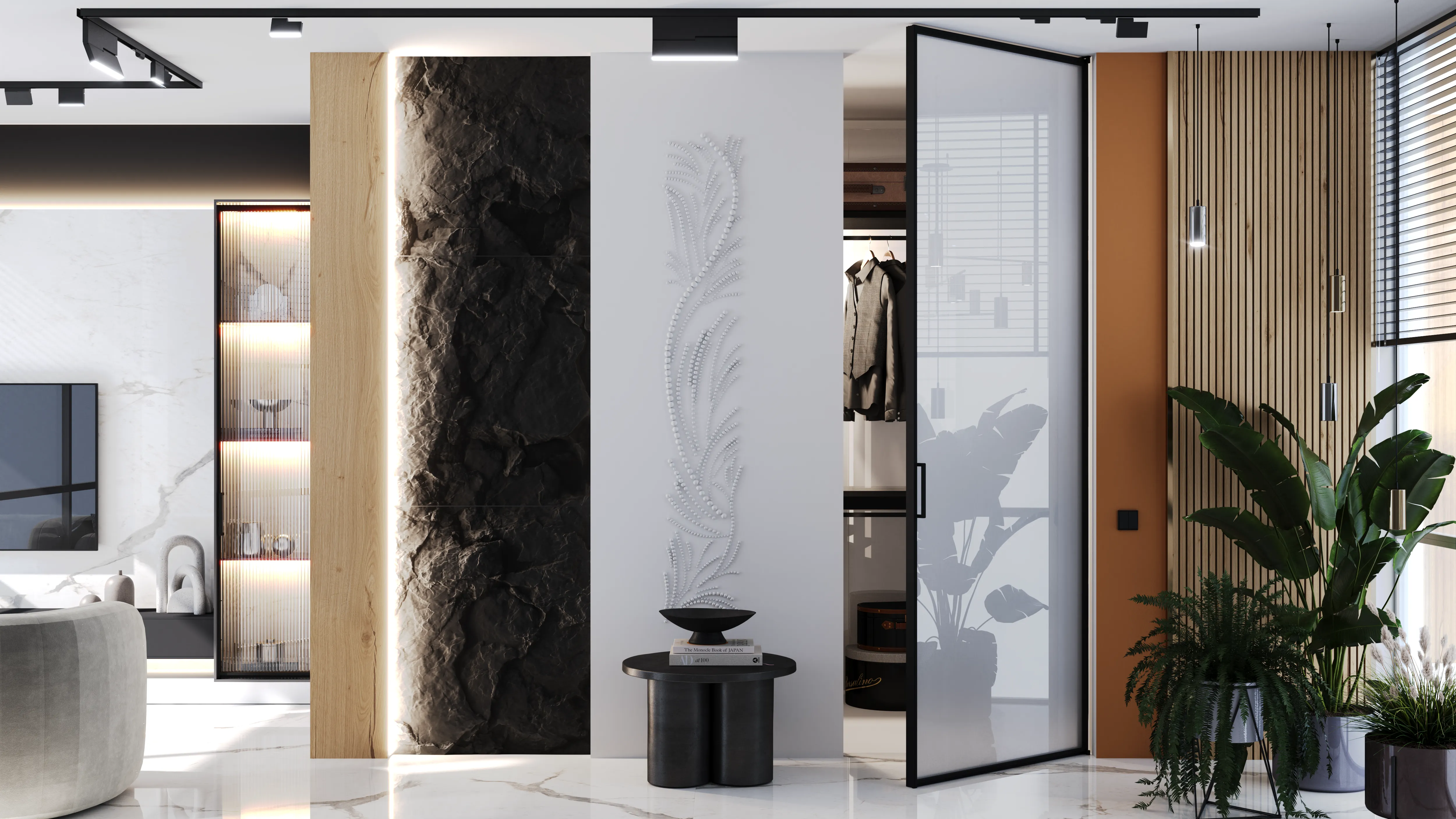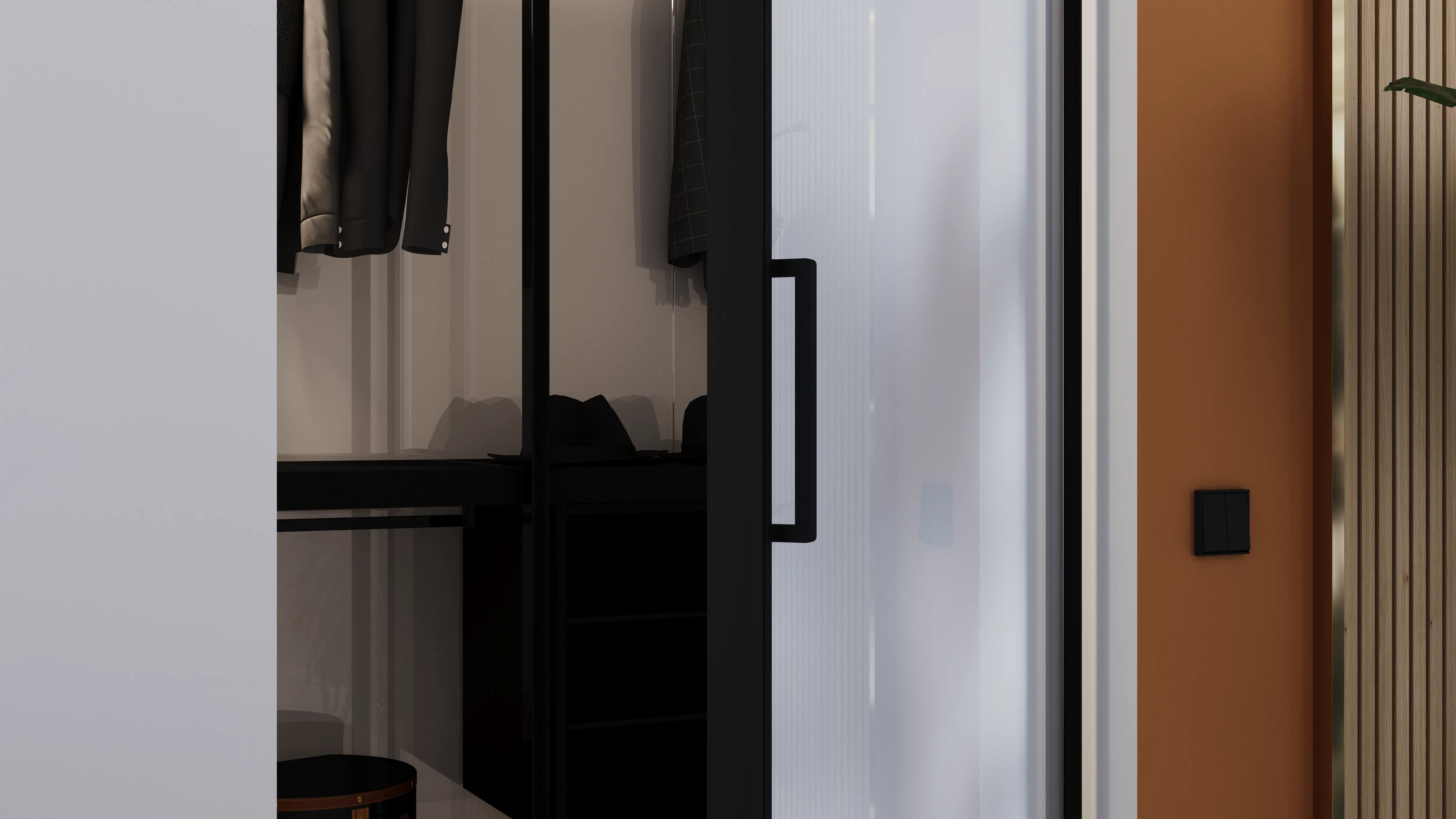 It is recommended to use pivot doors for built-in wardrobes with an opening of less than 1 m width. Available space for opening the doors is an obligatory requirement for this solution. Doors are installed without a bottom track.