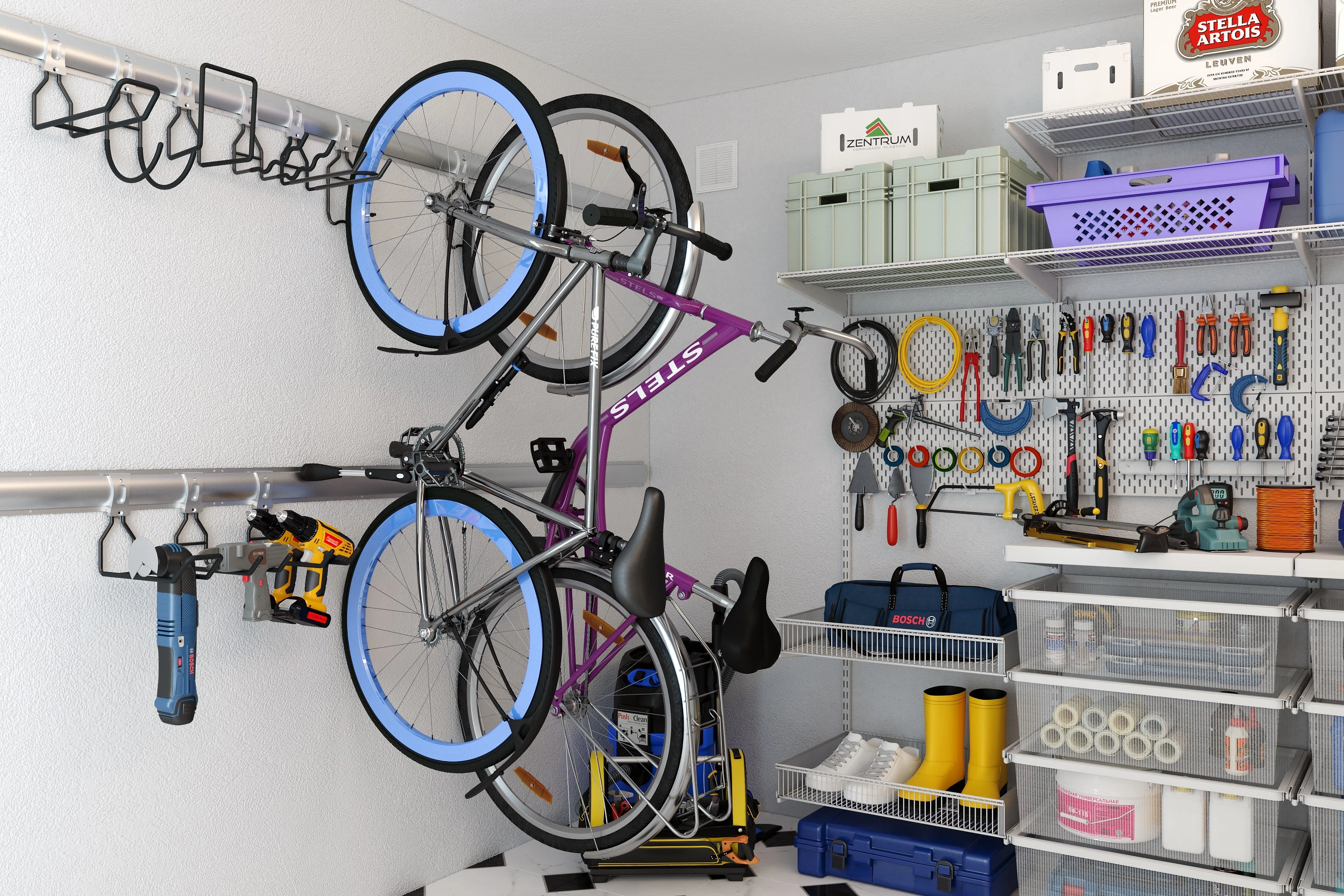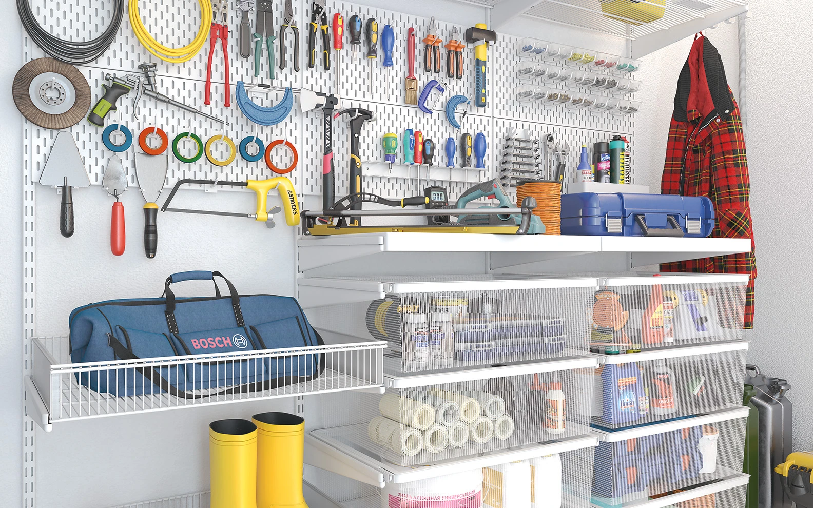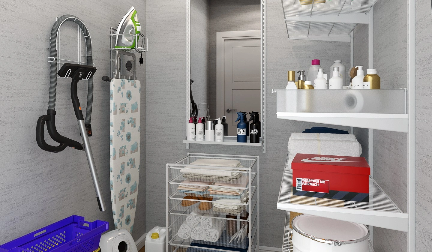 ARISTO storage system for utility room allows correct planning of the space and highlighting different zones: rarely used items, garden and hardware tools, sports equipment.